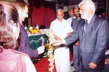 Dario Pagel, Président de la FIPF, inaugure le congrès en allumant le traditionnel kouthouvilakkou. De gauche à droite : Mme Joëlle Rayet, Consul général de France à Pondichéry, M. Dario Pagel, Président de la FIPF, M.V.Vaithilingam, Ministre de l’Industrie et de l’Énergie de l’État de Pondichéry, M. Singaravelou, Président, Université Michel de Montaigne Bordeaux 3, M. S.Kuppuswami, Président (par intérim) de l’Université de Pondichéry, et M.K.Madanagobalane, Président de l’AITF.