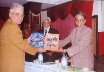 Première séance du congrès: M.Singaravelou, Président de la séance, présente les conférenciers M.Pierre Martinez (à g.) et M.K. Madavane (à dr.)