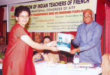 Lancement de Synchronie I et II, méthodes de français, par M. S.P.Thyagarajan. M François Wioland reçoit le premier exemplaire.