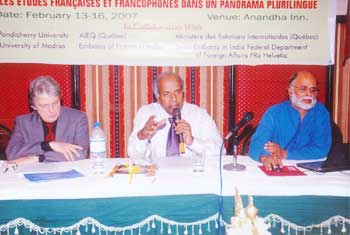 Ouverture du congrès (De g. à dr. : K.Madanagobalane, M.Pierre Koest, Attaché de la coopération éducative, Service culturel de l’Ambassade de France à New Delhi, M. S.P.Thyagarajan, Ancien Président de l’université de Madras, M.S.Kuppuswamy, Président de l’université Pondichéry (par intérim), M.V.Vaithilingam, Ministre de l’Industrie et de l’Energie, M Singaravelou, Président de l’université Michel de Montaigne, Bordeaux 3 et M. E.Sundaramurthy, Ancien Président de l’université Tamoule, Tanjore).