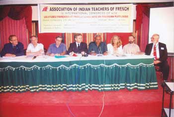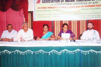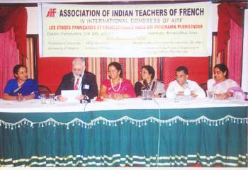 Synthèse du congrès. De g. à dr. : Mme. N. Kamala, professeur de JNU, M.François Xavier Nève de Mévergnies, Mme.Vidya Vencatesan, Mme Vijaya Roa, professeur de JNU, M. Marie-Pierre Augustin, Chef du département de français, Université de Madurai-Kamaraj, Mme Varalakshmi Anandkumar, maître de conférences à QMC, Chennai.