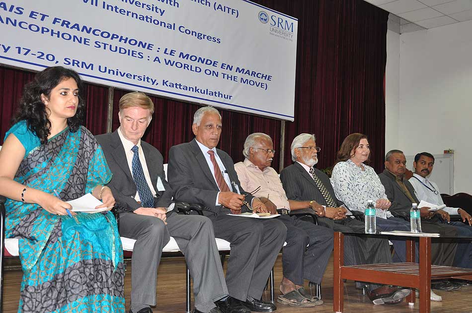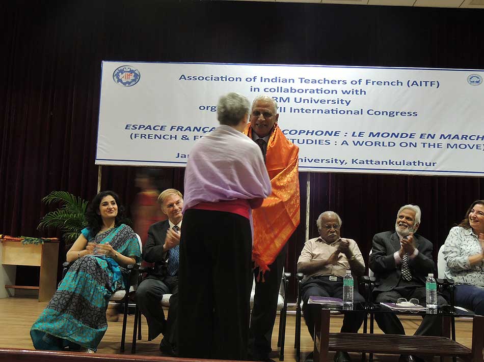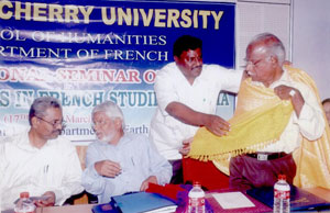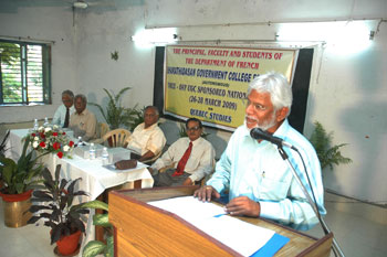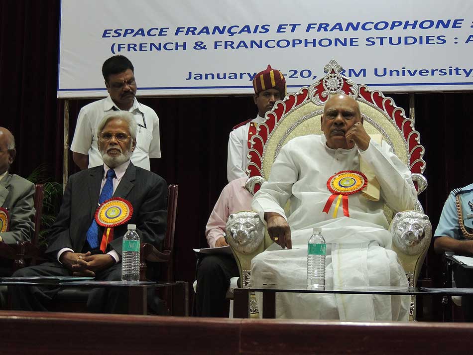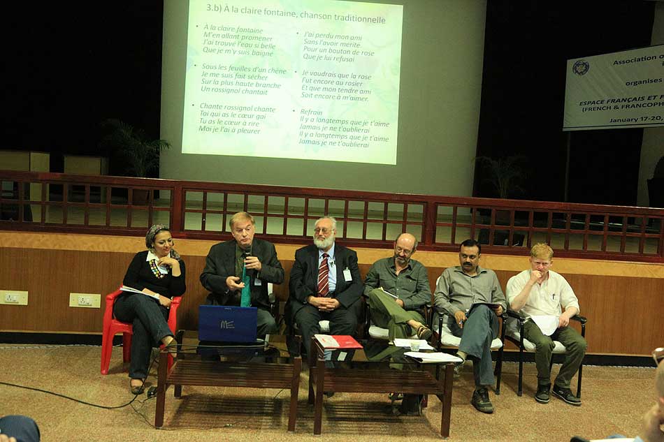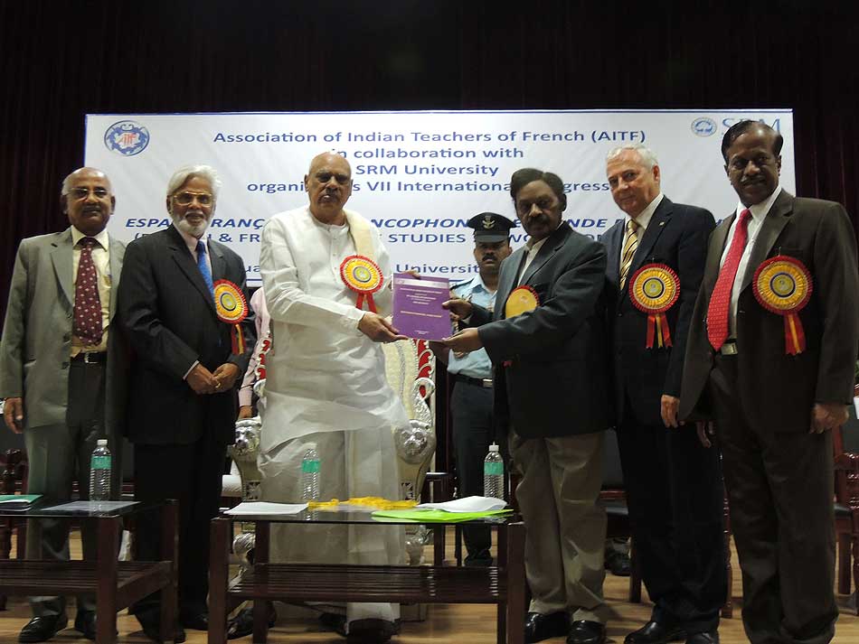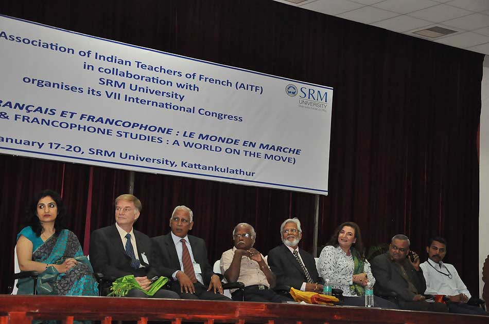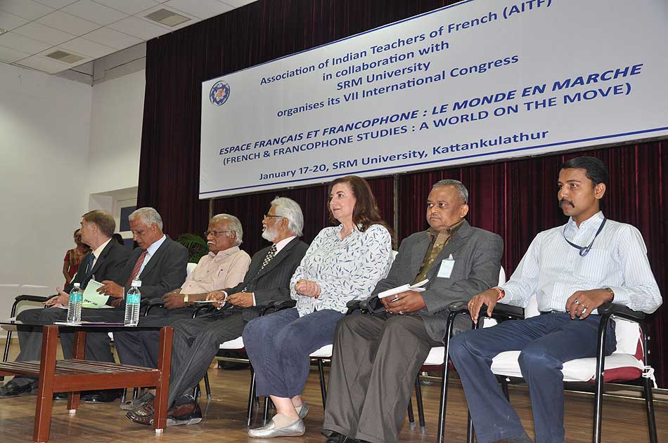 de g. à dr. : Mme N Kamala, Directeur du Centre des études françaises et francophones, JNU, Mme Kiran Chowdry, Professeur, JNU, Dasmahapatra, Professeur, BHU, Dr Nallam, Président de l’Alliance française de Pondichéry, Jose Thomas, Doyen, EFLU, Hyderabad, S Pannirselvame, Directeur du département de français, Pondicherry University