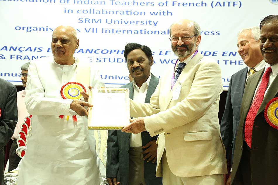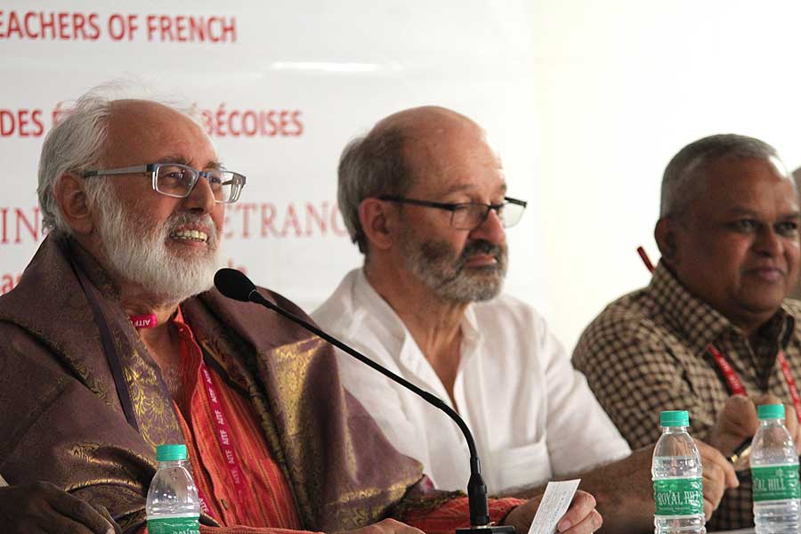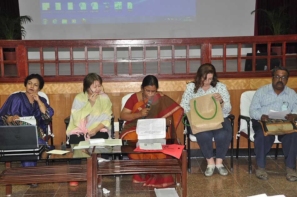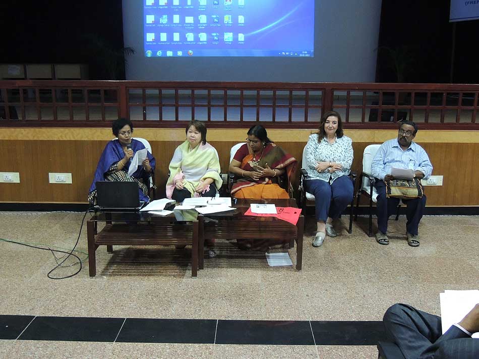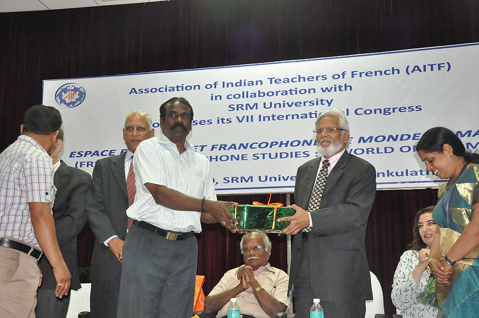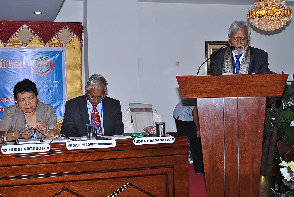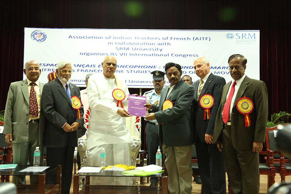 de g. à dr. : Mme N Kamala, Directeur du Centre des études françaises et francophones, JNU, Mme Kiran Chowdry, Professeur, JNU, Dasmahapatra, Professeur, BHU, Dr Nallam, Président de l’Alliance française de Pondichéry, Jose Thomas, Doyen, EFLU, Hyderabad, S Pannirselvame, Directeur du département de français, Pondicherry University