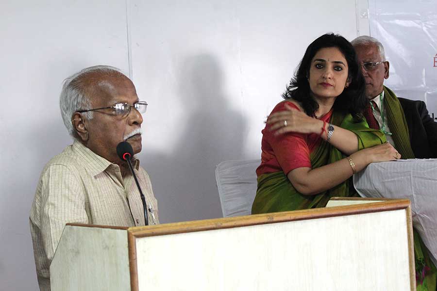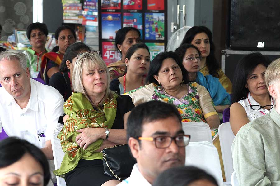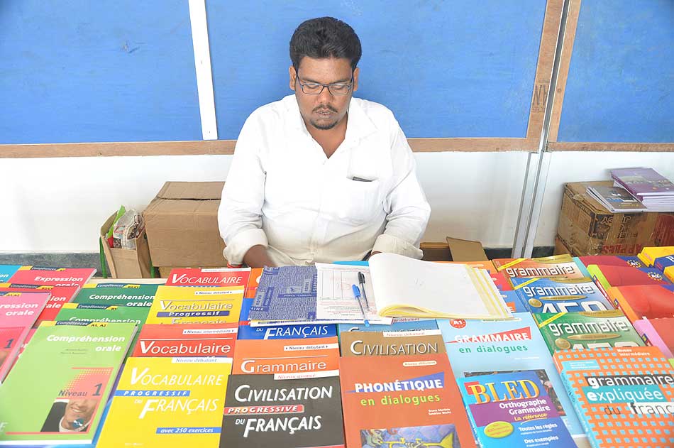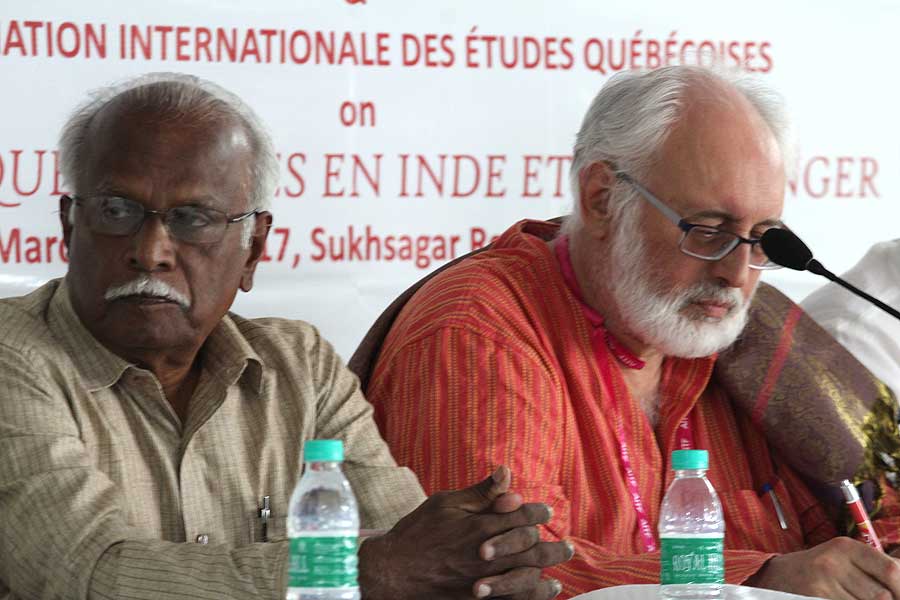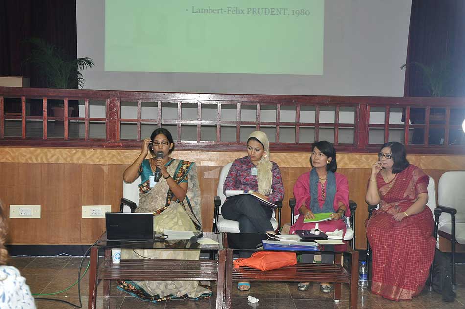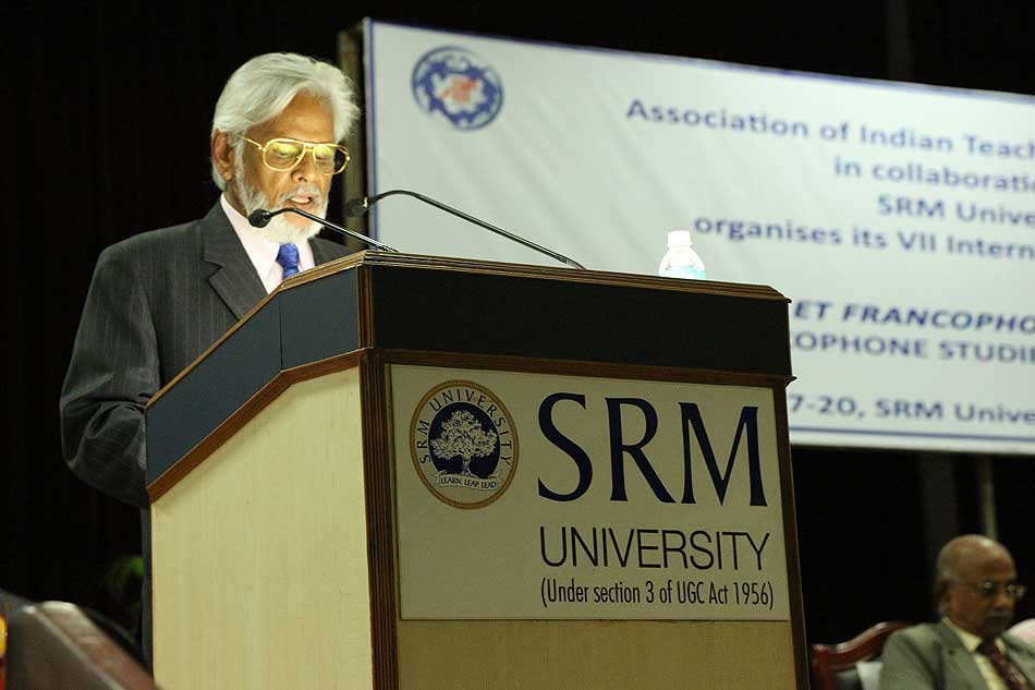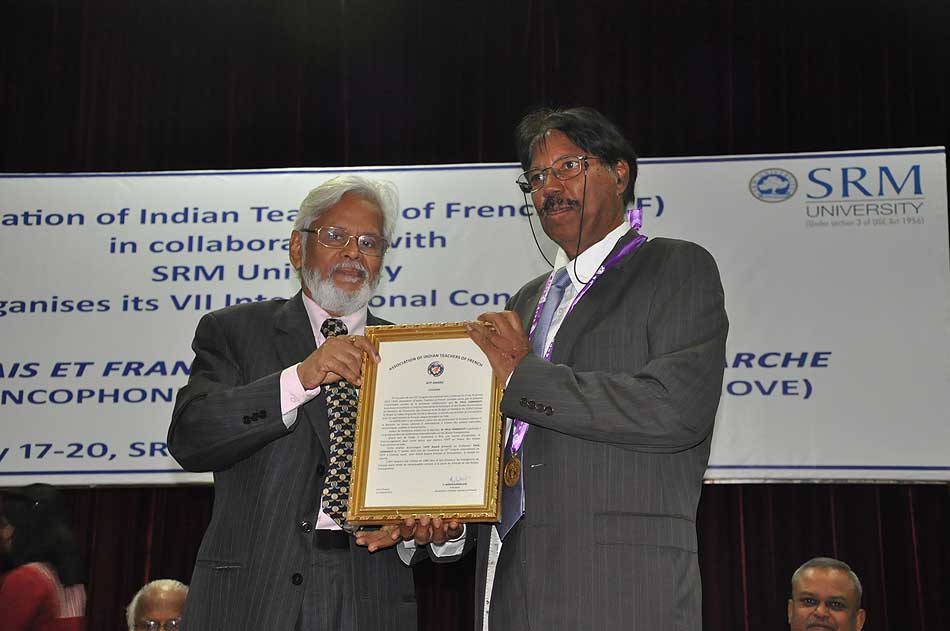 de g. à dr. : Mme N Kamala, Directeur du Centre des études françaises et francophones, JNU, Mme Kiran Chowdry, Professeur, JNU, Dasmahapatra, Professeur, BHU, Dr Nallam, Président de l’Alliance française de Pondichéry, Jose Thomas, Doyen, EFLU, Hyderabad, S Pannirselvame, Directeur du département de français, Pondicherry University
