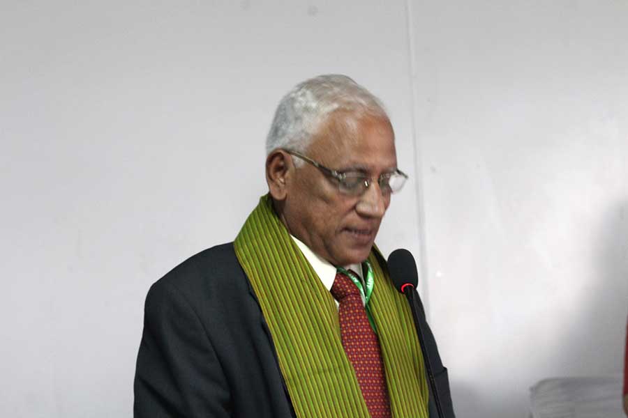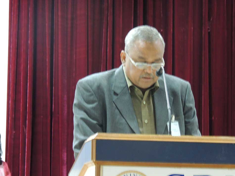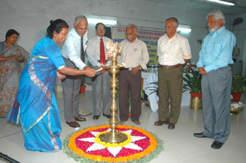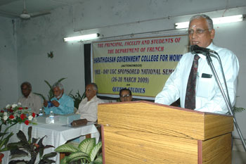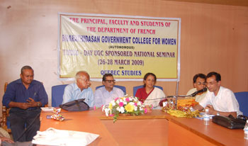 de g. à dr. : Mme Madanabathmavathy, Directeur du séminaire et chef du département de français, BGCW, Puducherry, MM. Venguattaramane, Doyen-CDC, Pondicherry University, G Babu Rao, Principal, BGCW, R Kichenamourty, UGC Emeritus Fellow, Pondicherry University, Gopalji Malviya, Directeur du département de Defence and Strategic Studies,Université de Madras, K Madanagobalane, UGC Emeritus Fellow, BHU