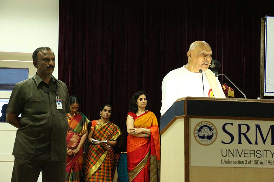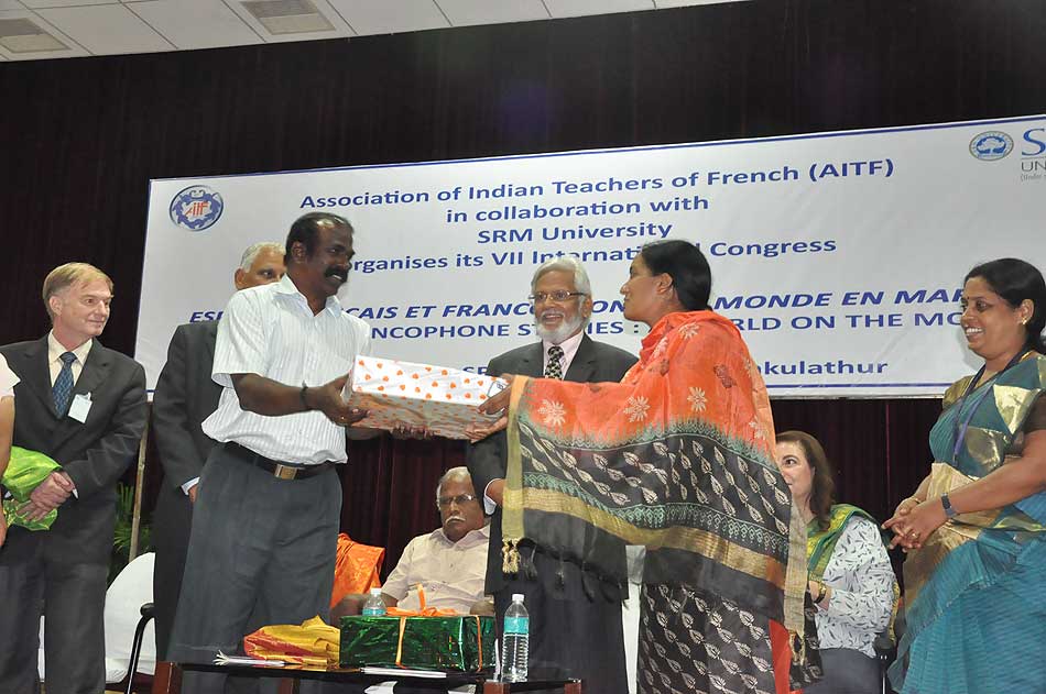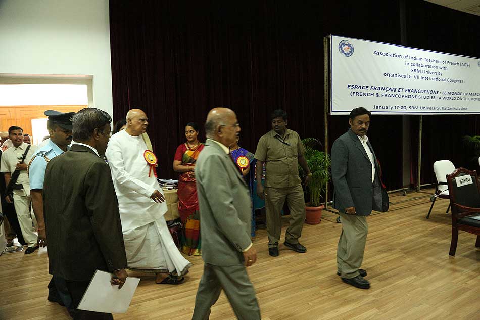 de g. à dr. : MM. S Pannirselvame, R Kichenamourty, G Babu Rao, Mme N Kamala, MM. Marie Pierre Augustin, Directeur du département de français, Madurai Kamaraj Univeristy, Ashish Agnihotri, Secrétaire Adjoint, IAQS