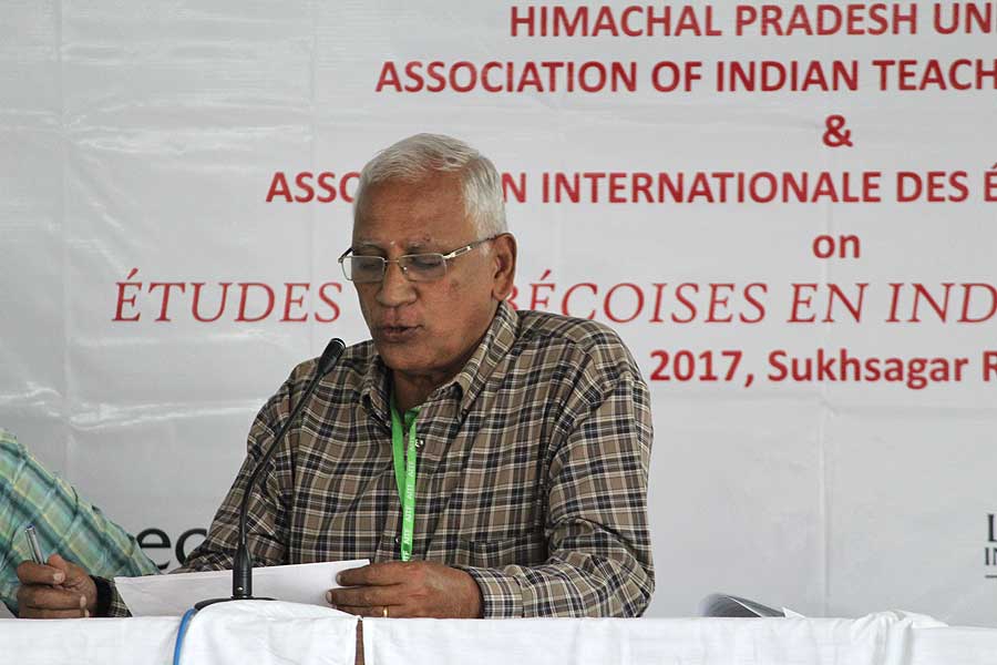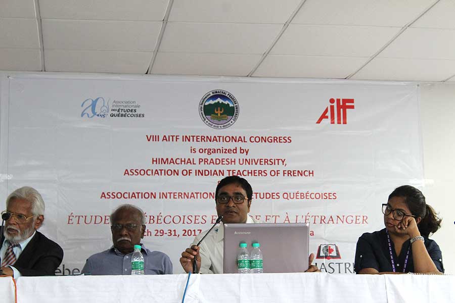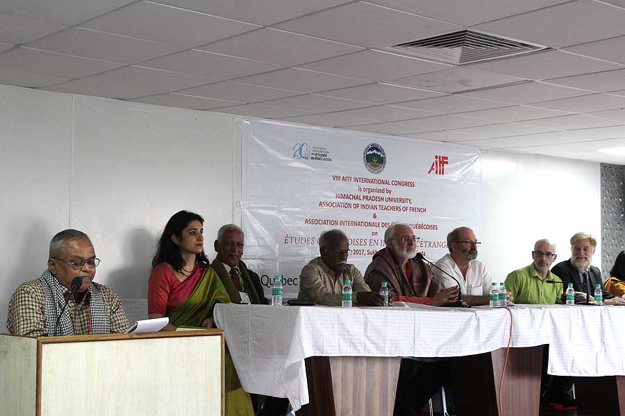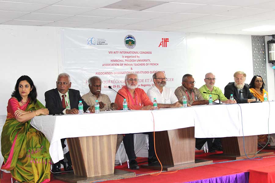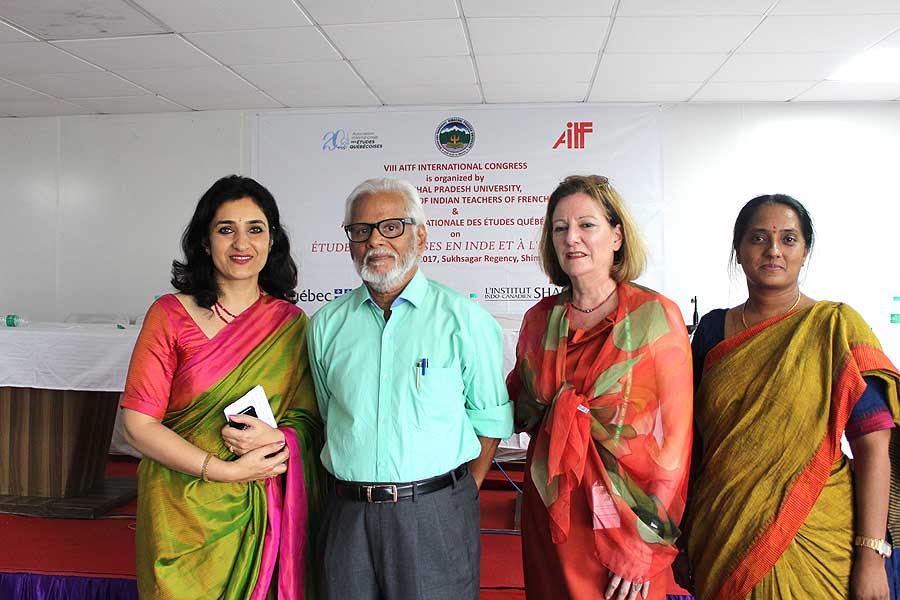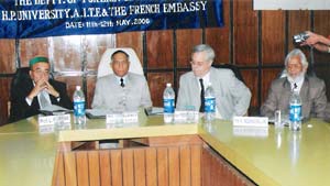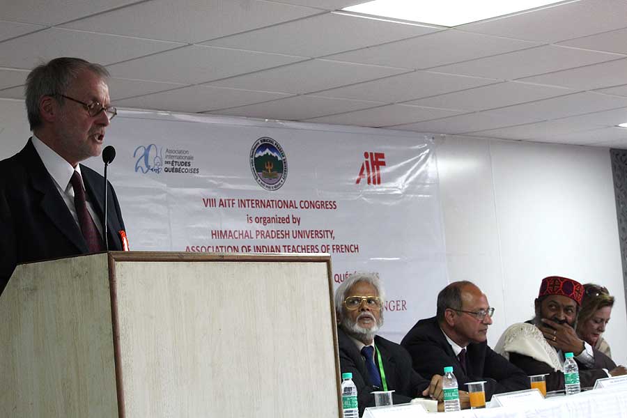 La séance d’ouverture du séminaire « Quel français faut-il enseigner ? » à Shimla, mai 2006. De g. à d. : Prof. L.N.Sharma (Vice-Chancellor, Himachal Pradesh University), Son Excellence, M.Kokje (Governor, Himachal Pradesh), M.Pierre Koest (Attaché de coopération éducative, Ambassade de France en Inde), Prof. K.Madanagobalane (Président, AITF)